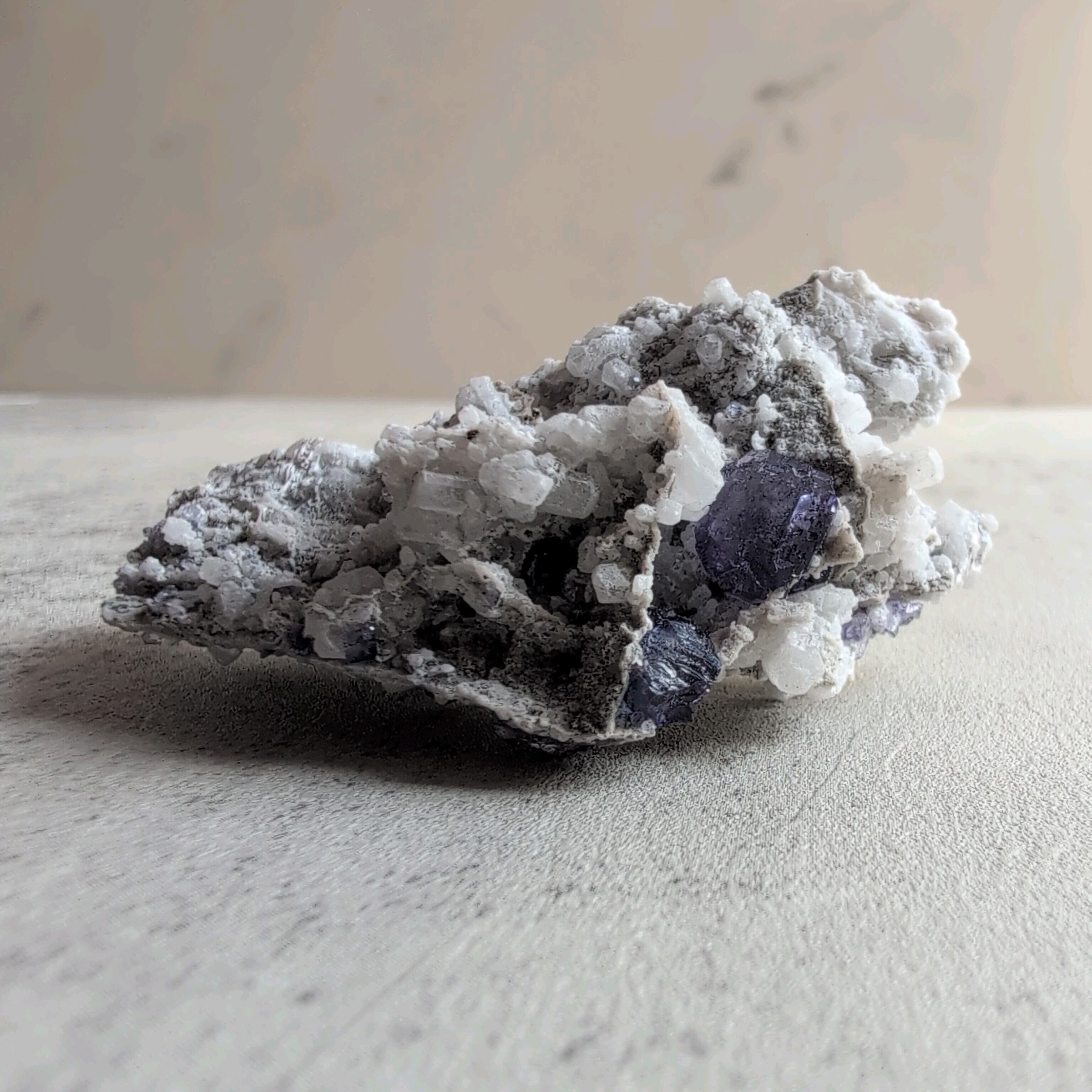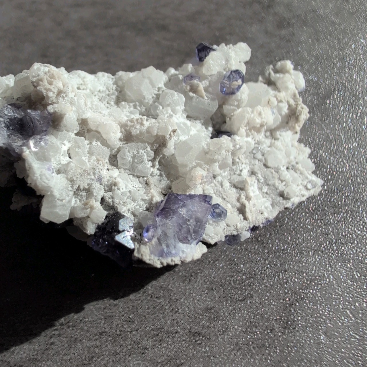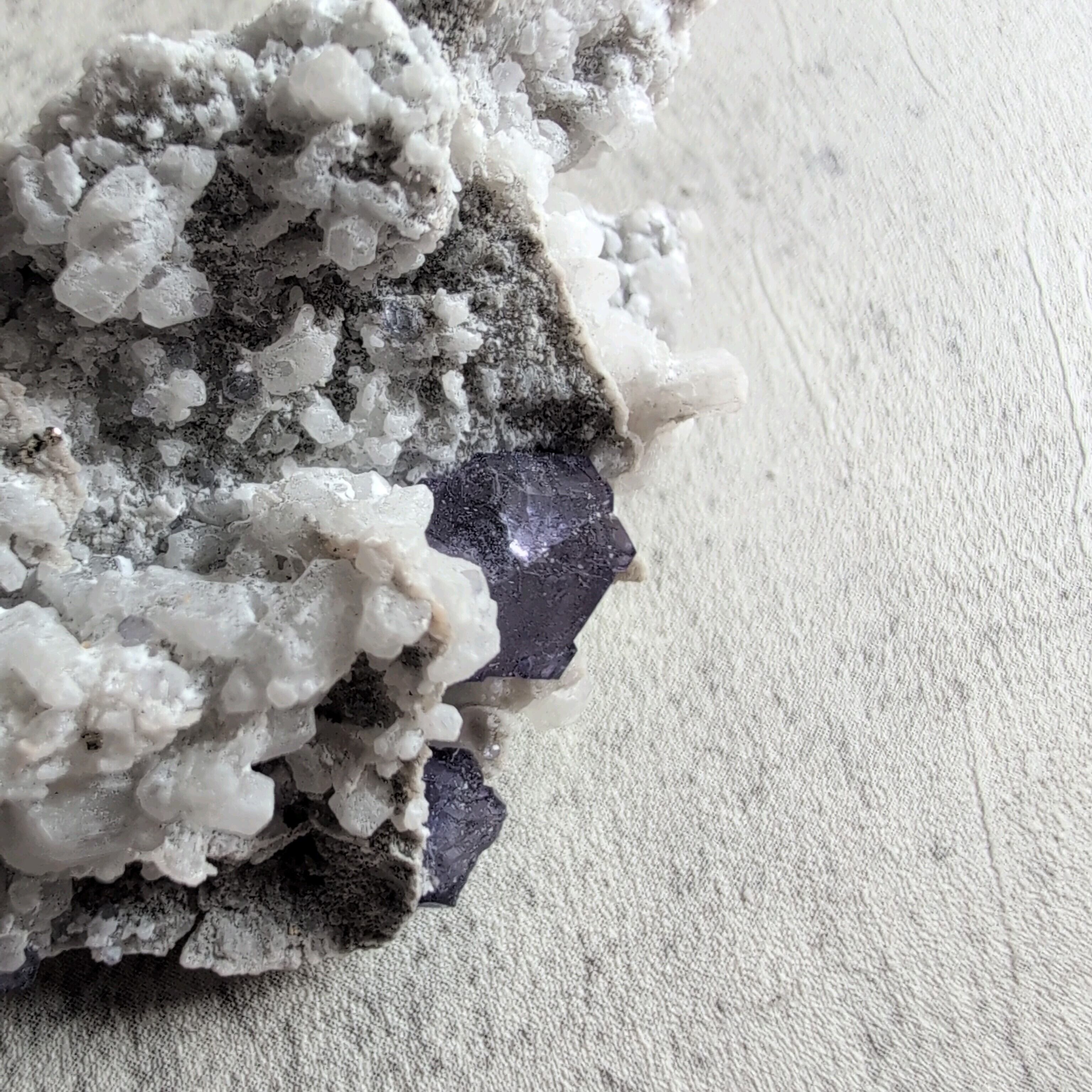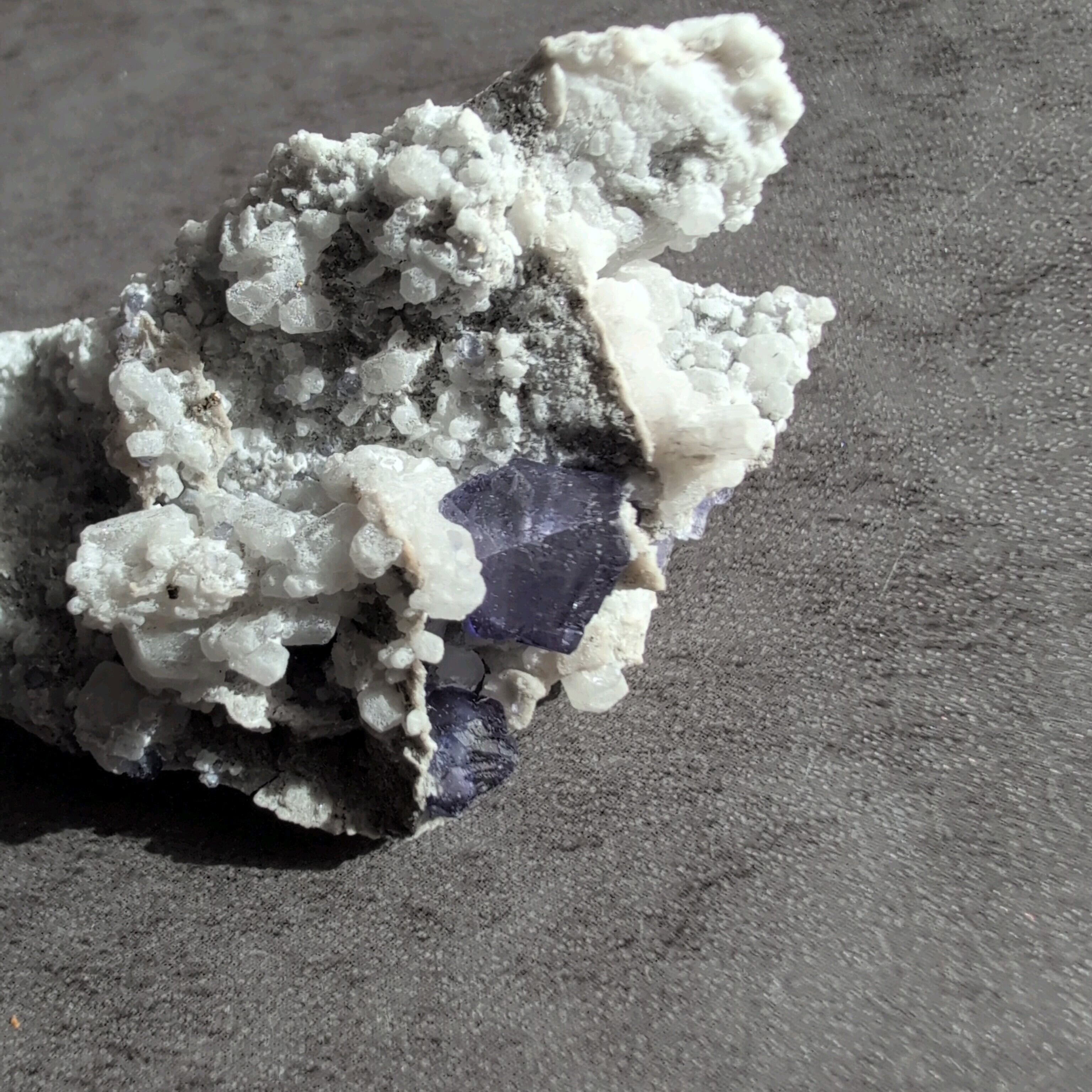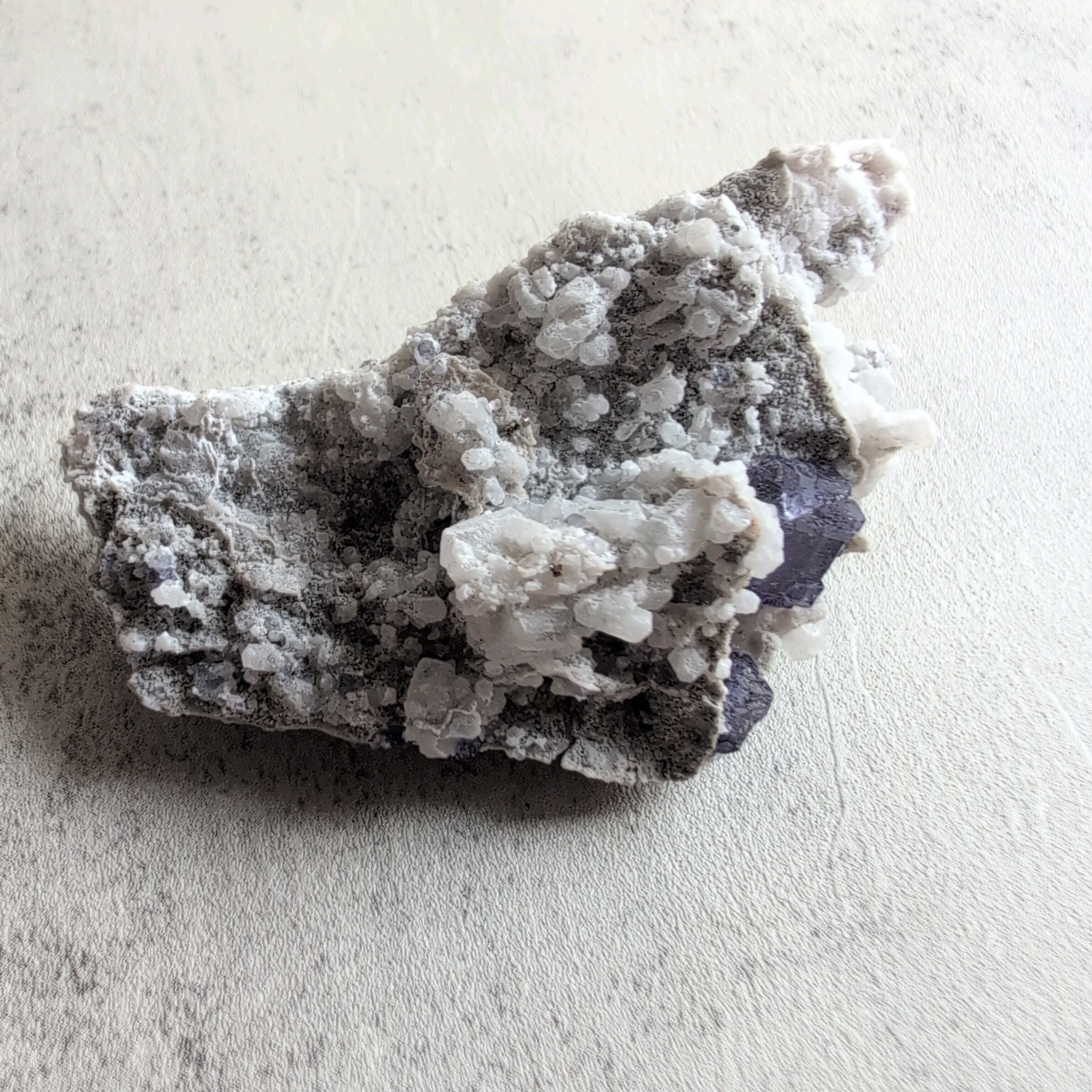 タンザナイトとフローライトがカルサイト層と共生しています。