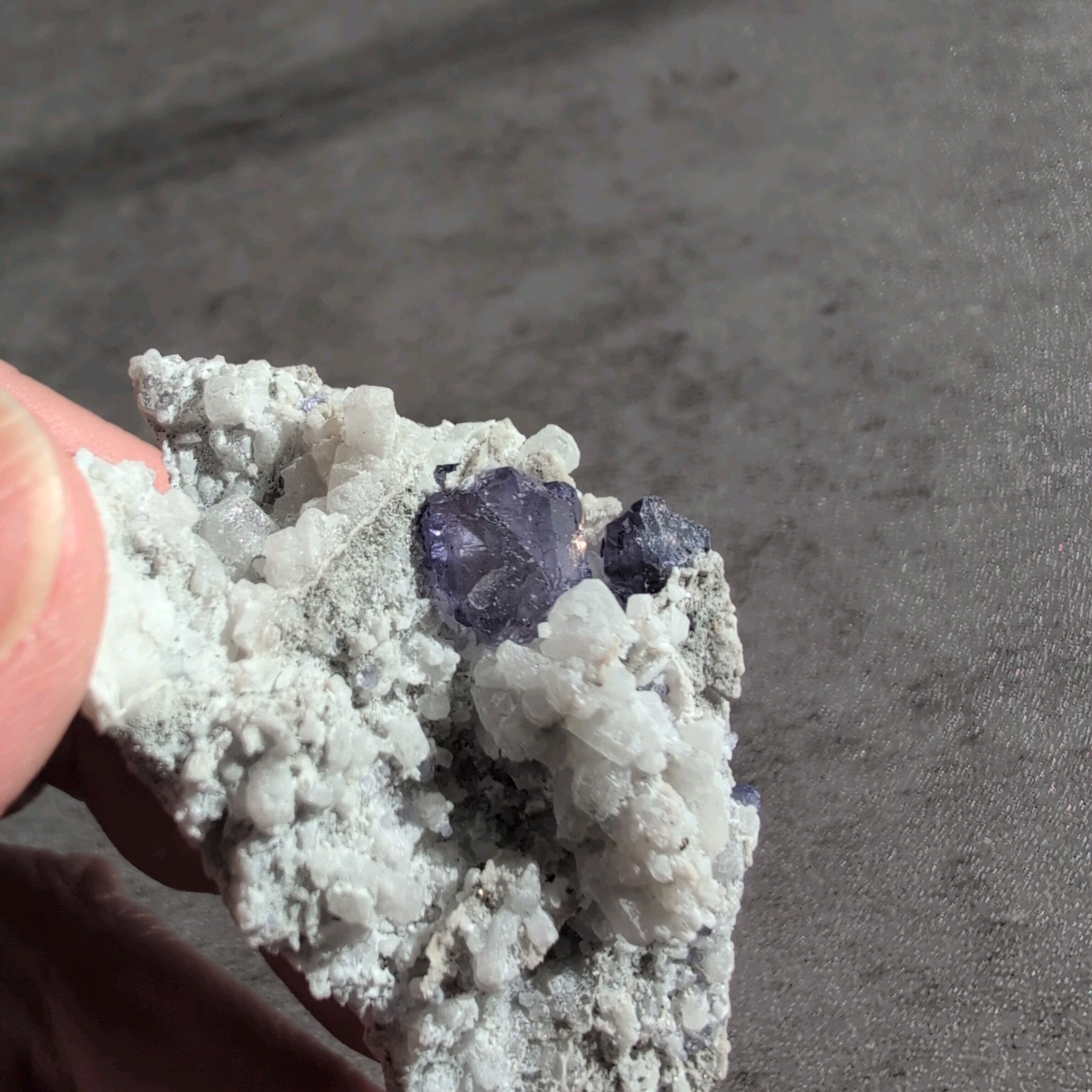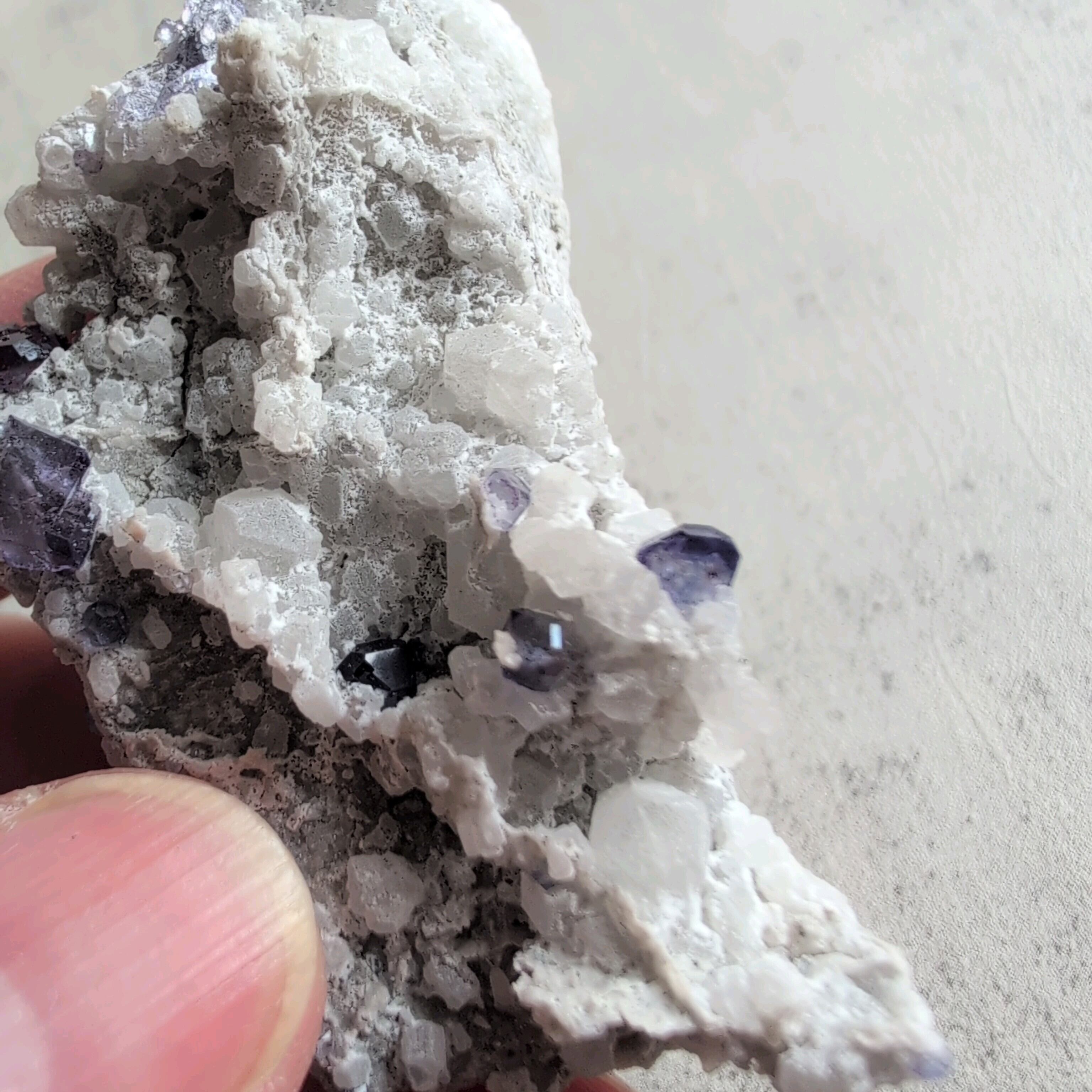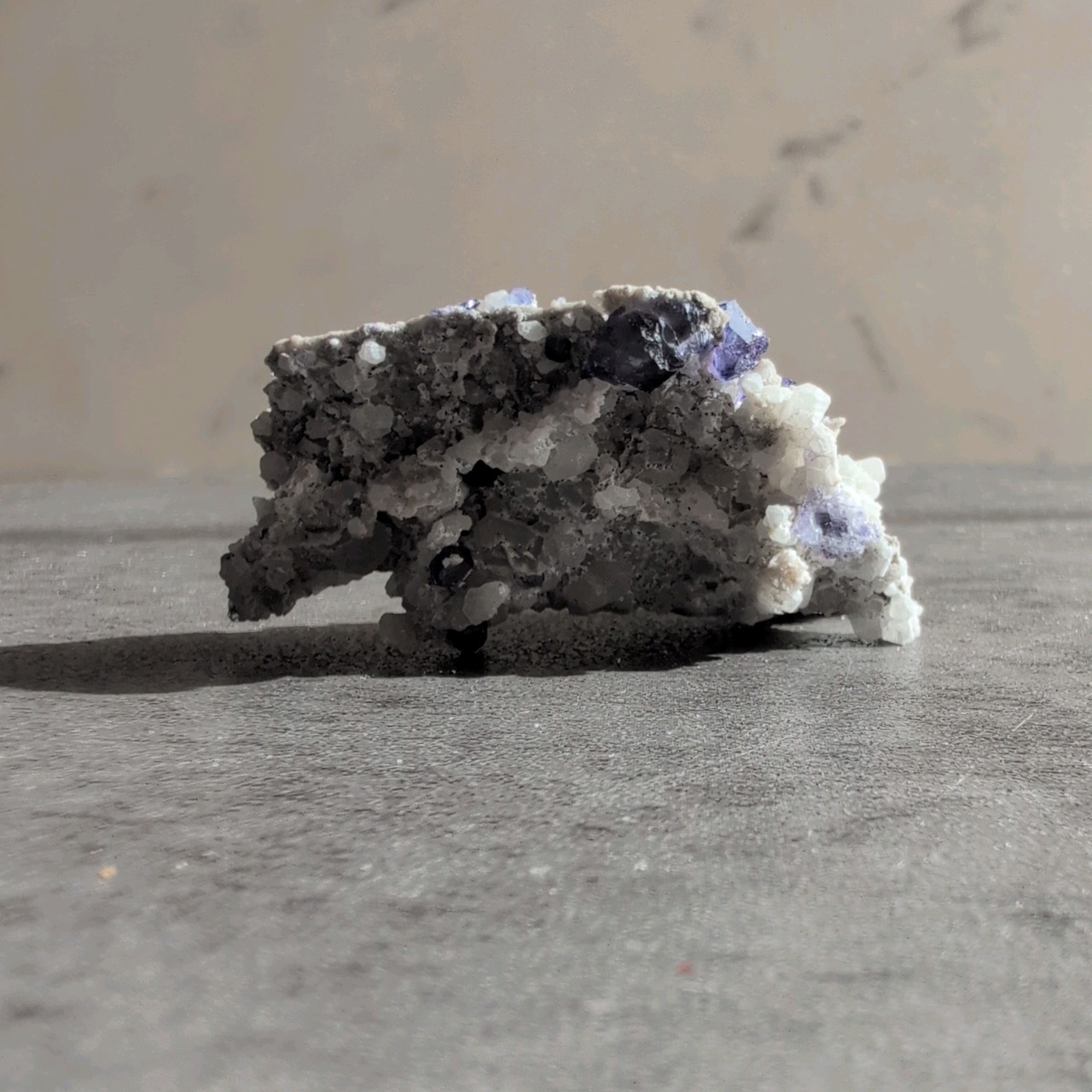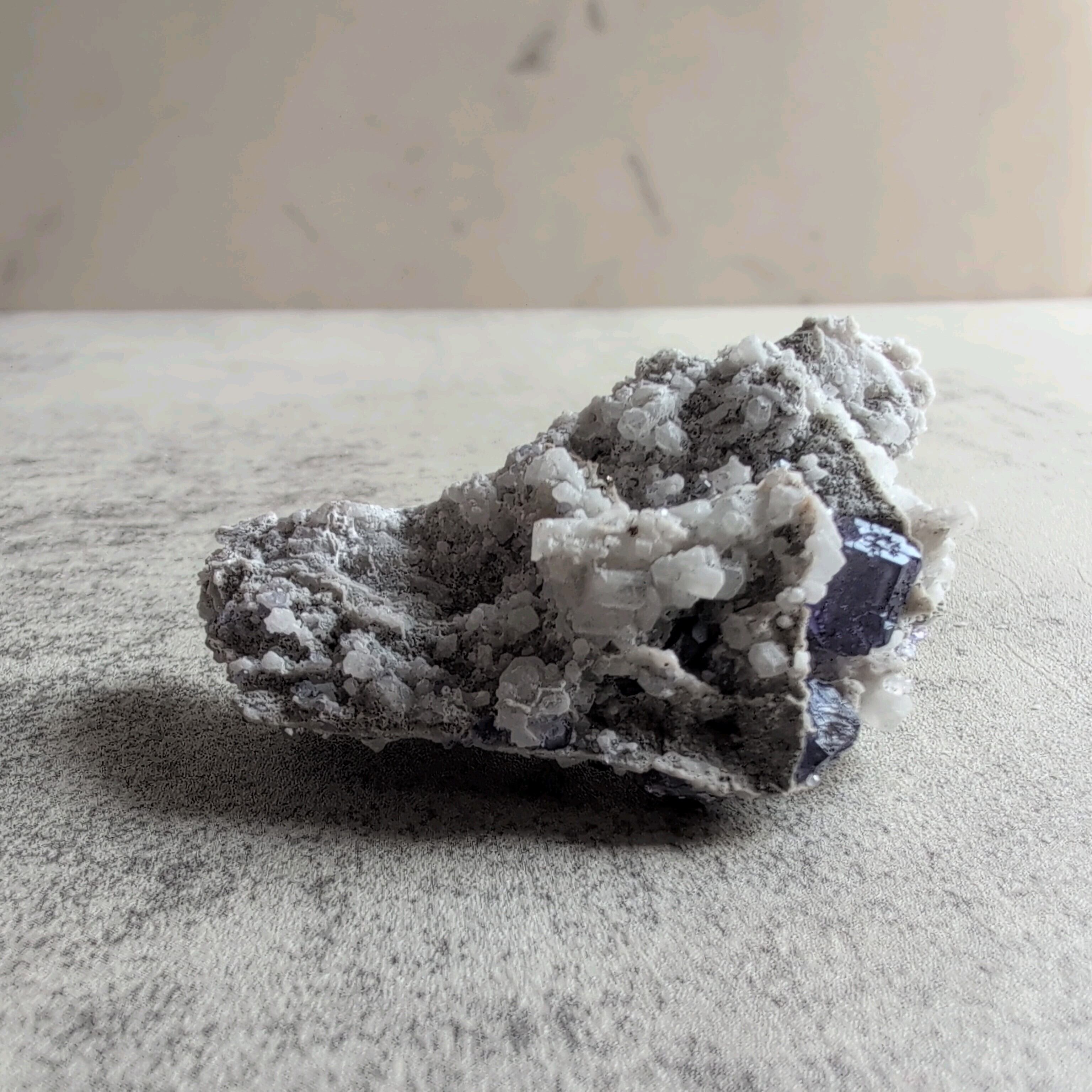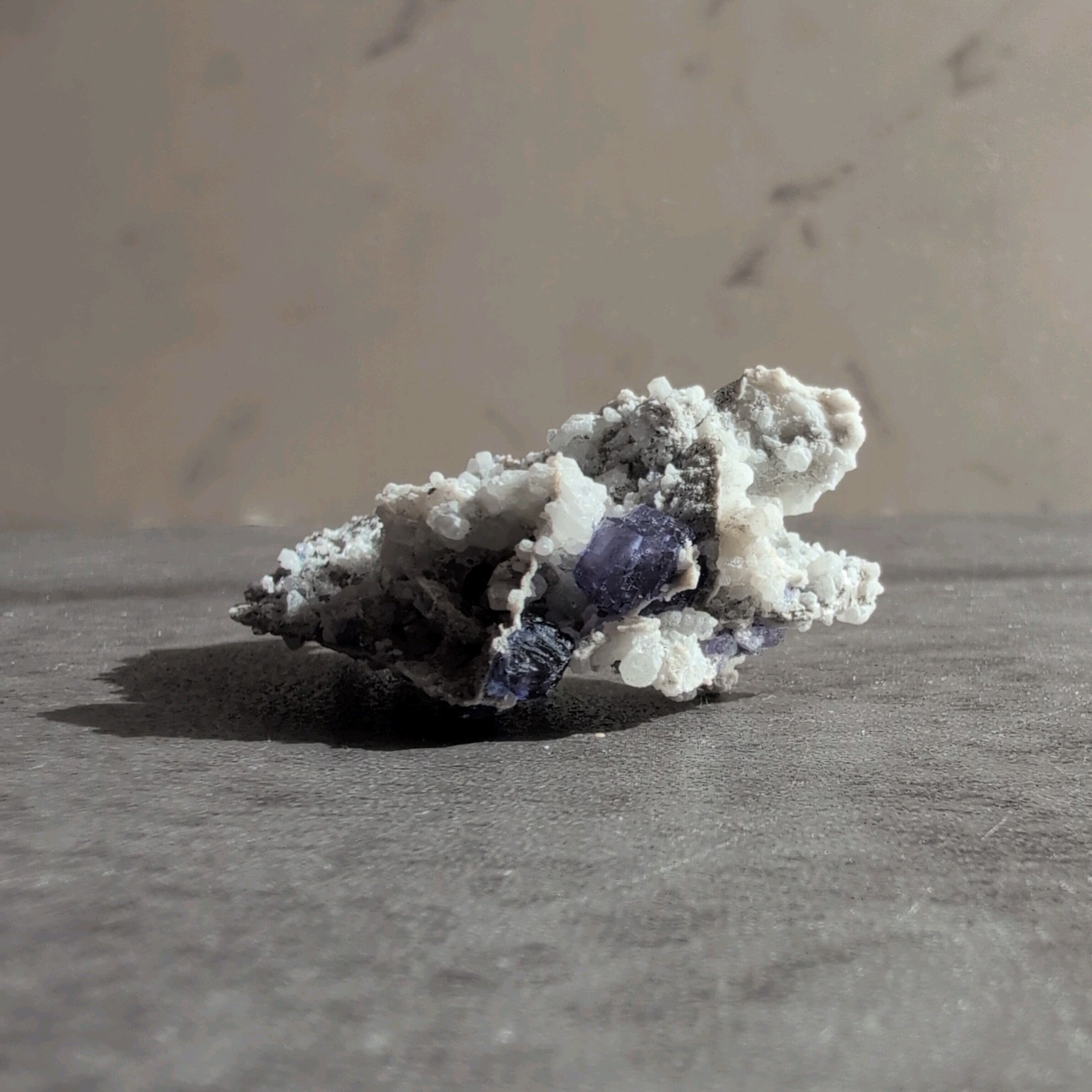 タンザナイトとフローライトがカルサイト層と共生しています。