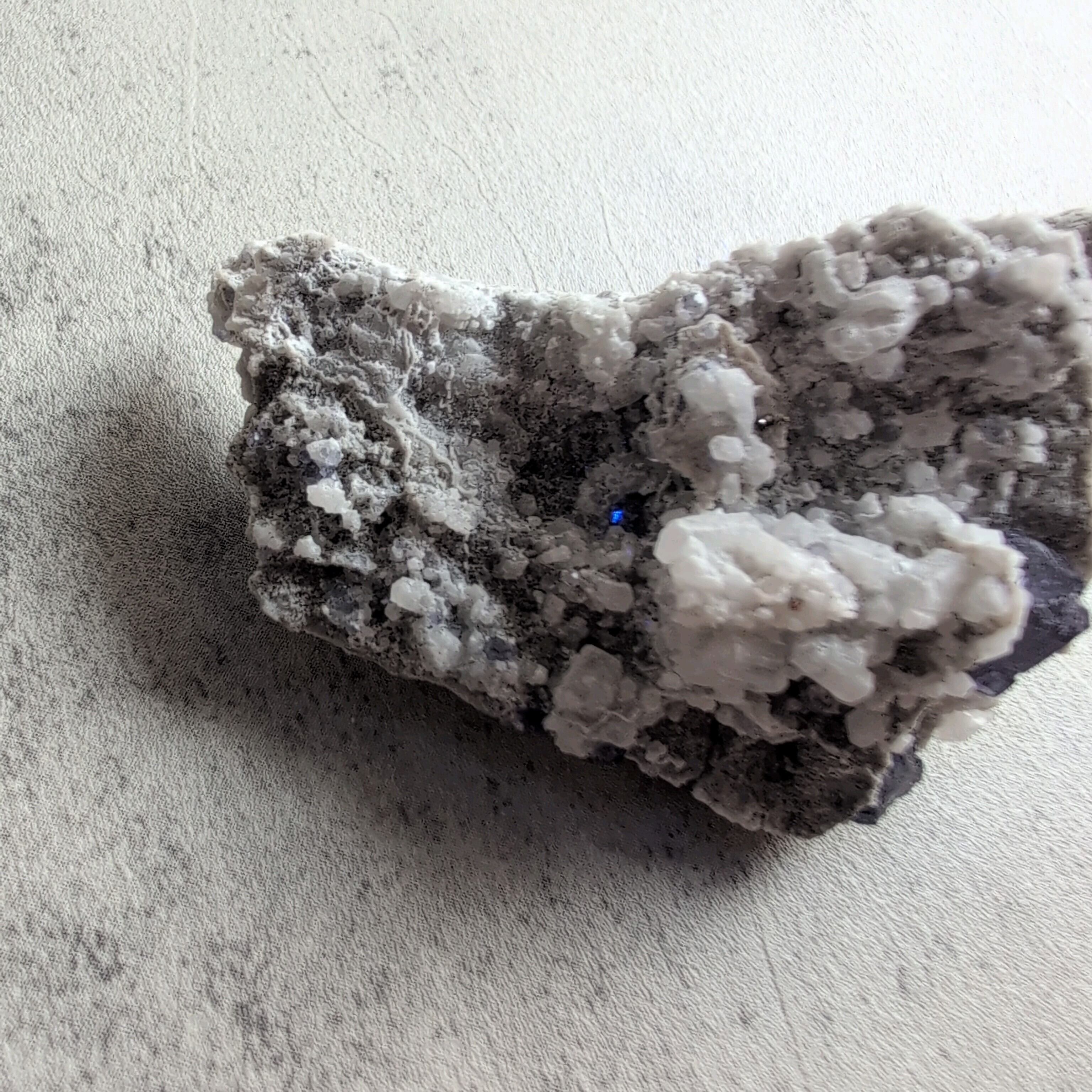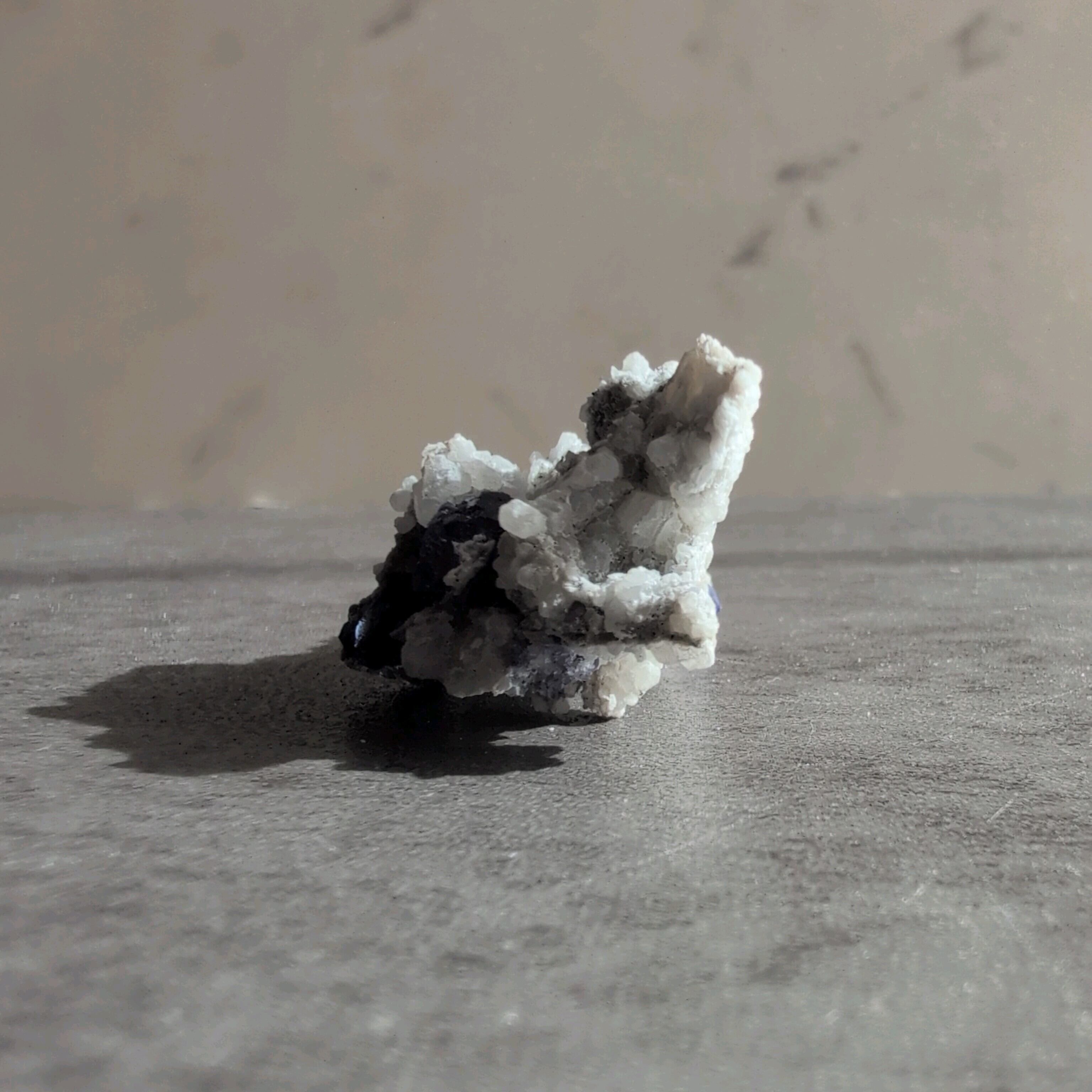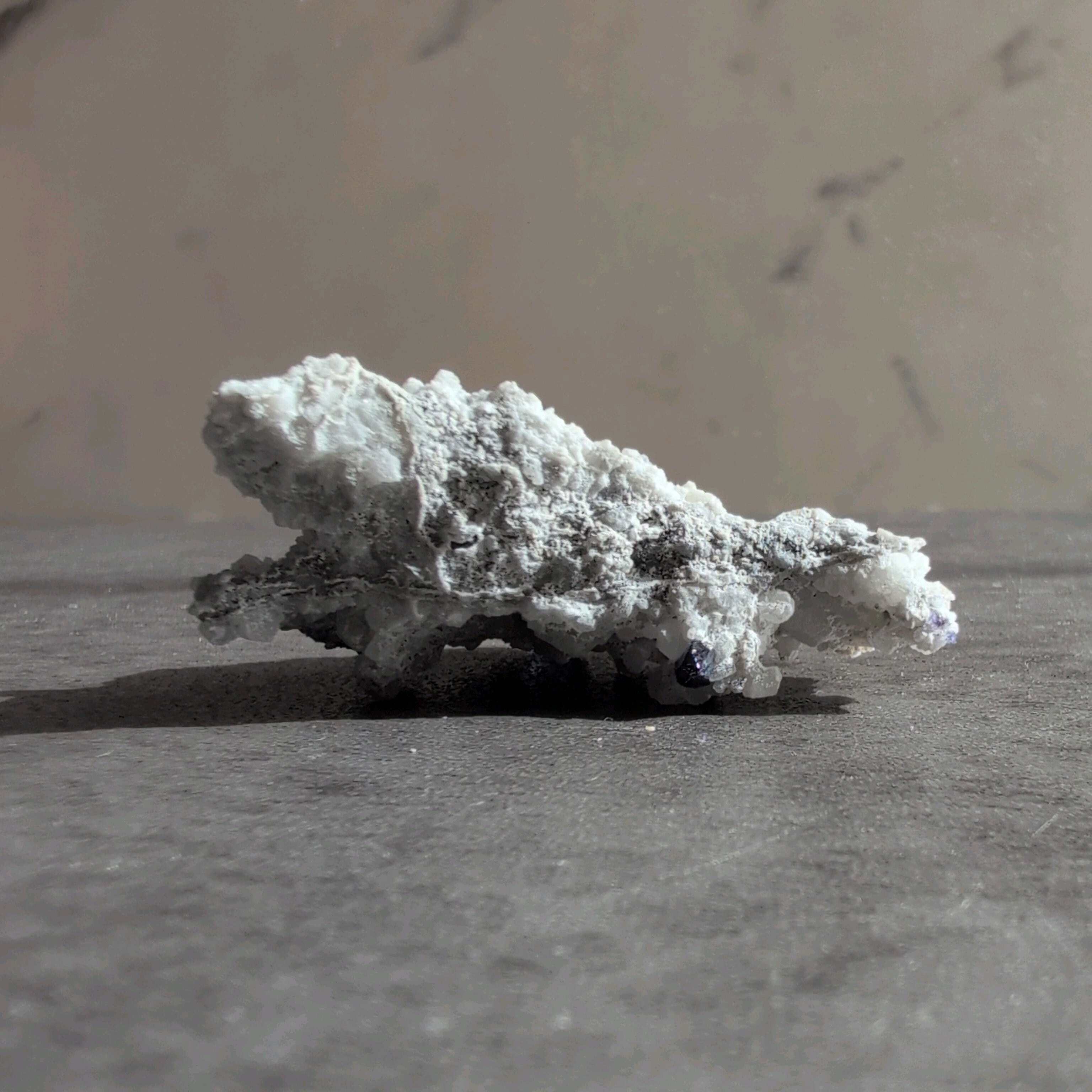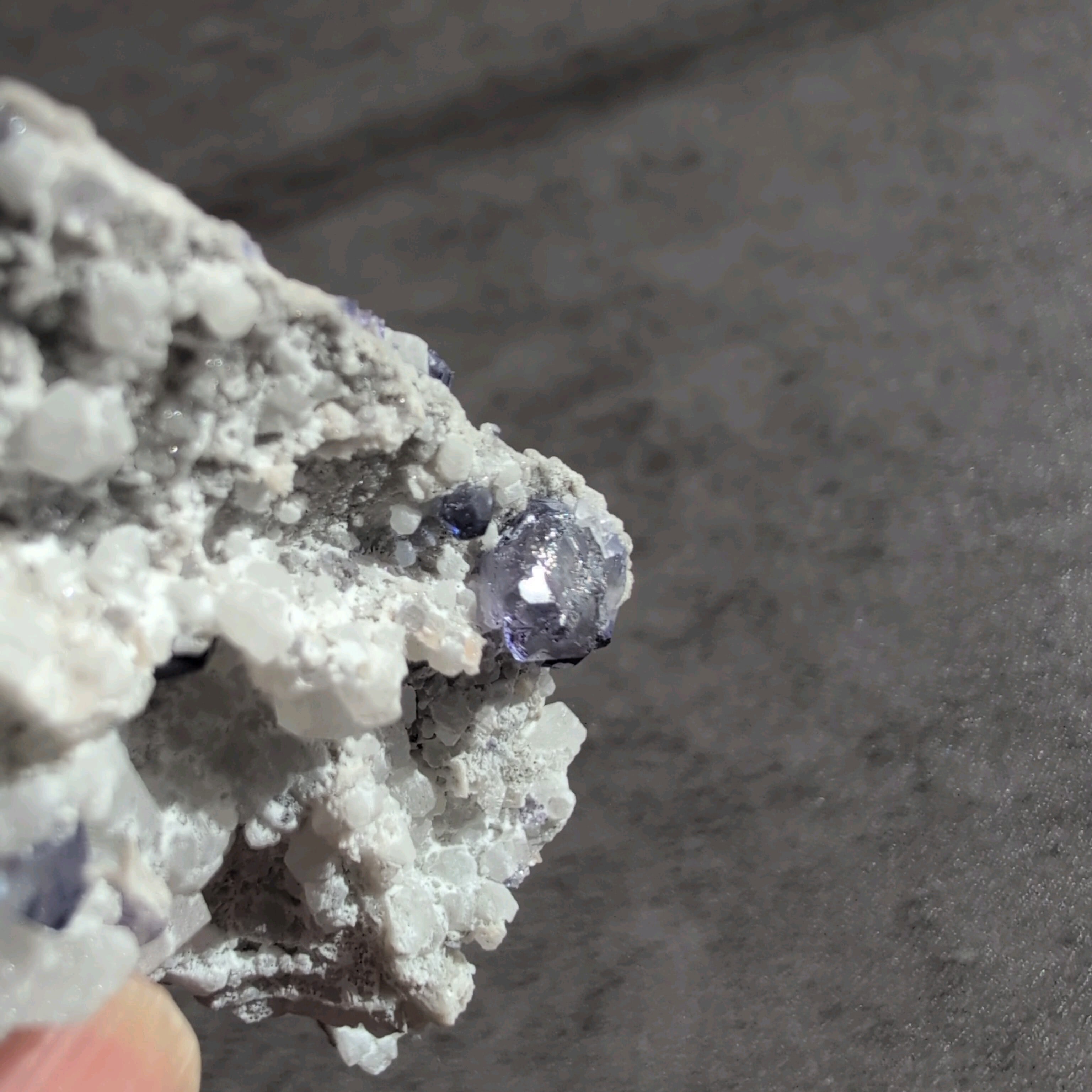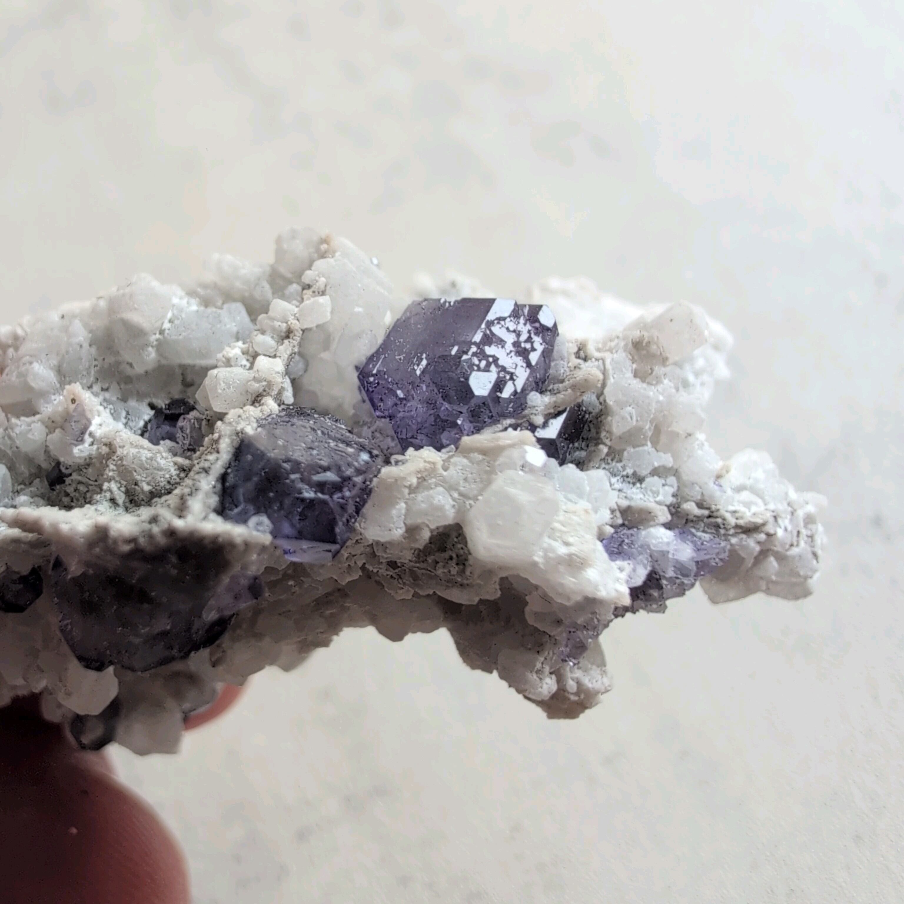 タンザナイトとフローライトがカルサイト層と共生しています。