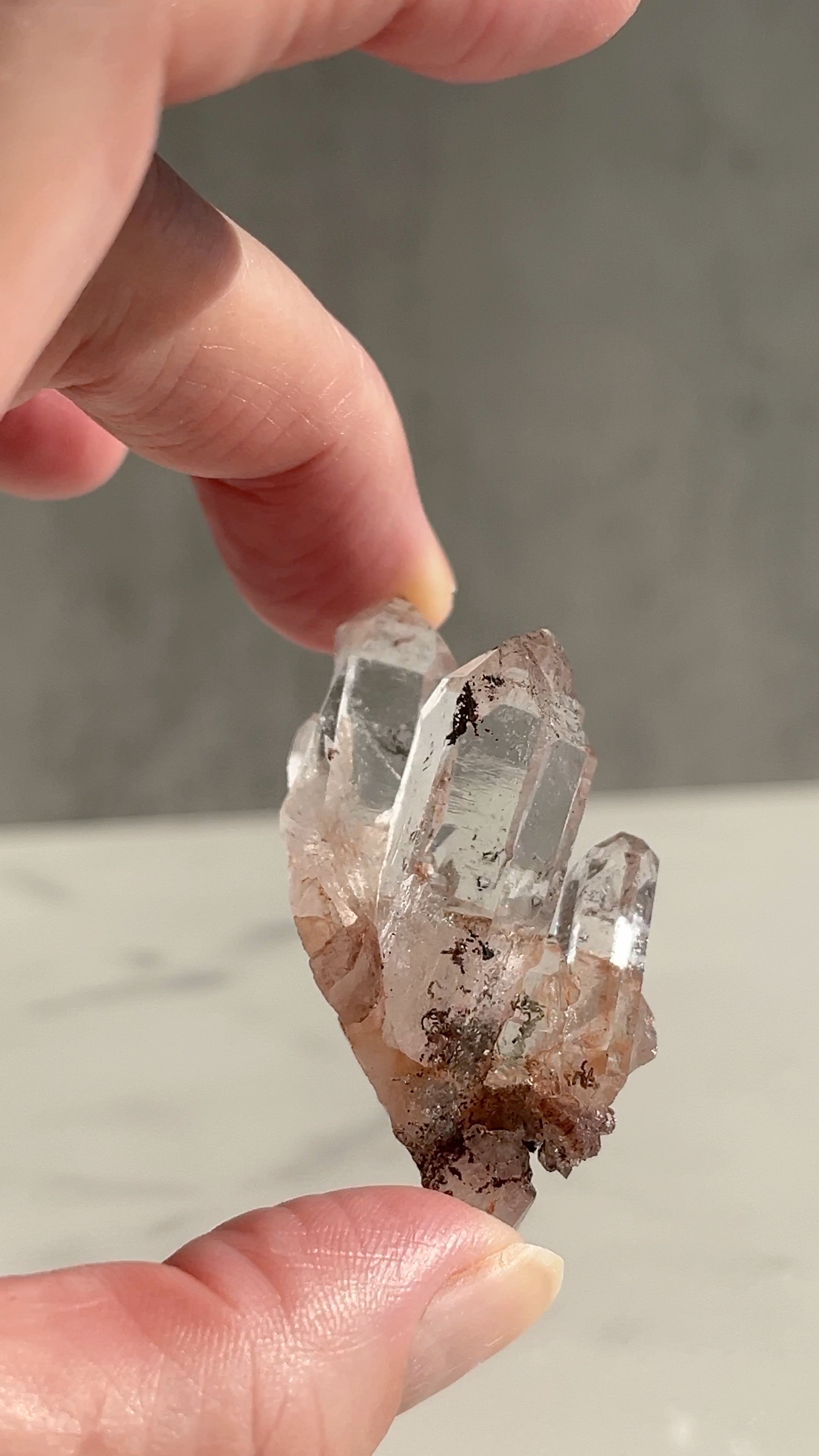 光を透過したときには淡いピンク色になり、ヒマラヤ水晶の抜群の透明度にピンクのベールをかけたようです。