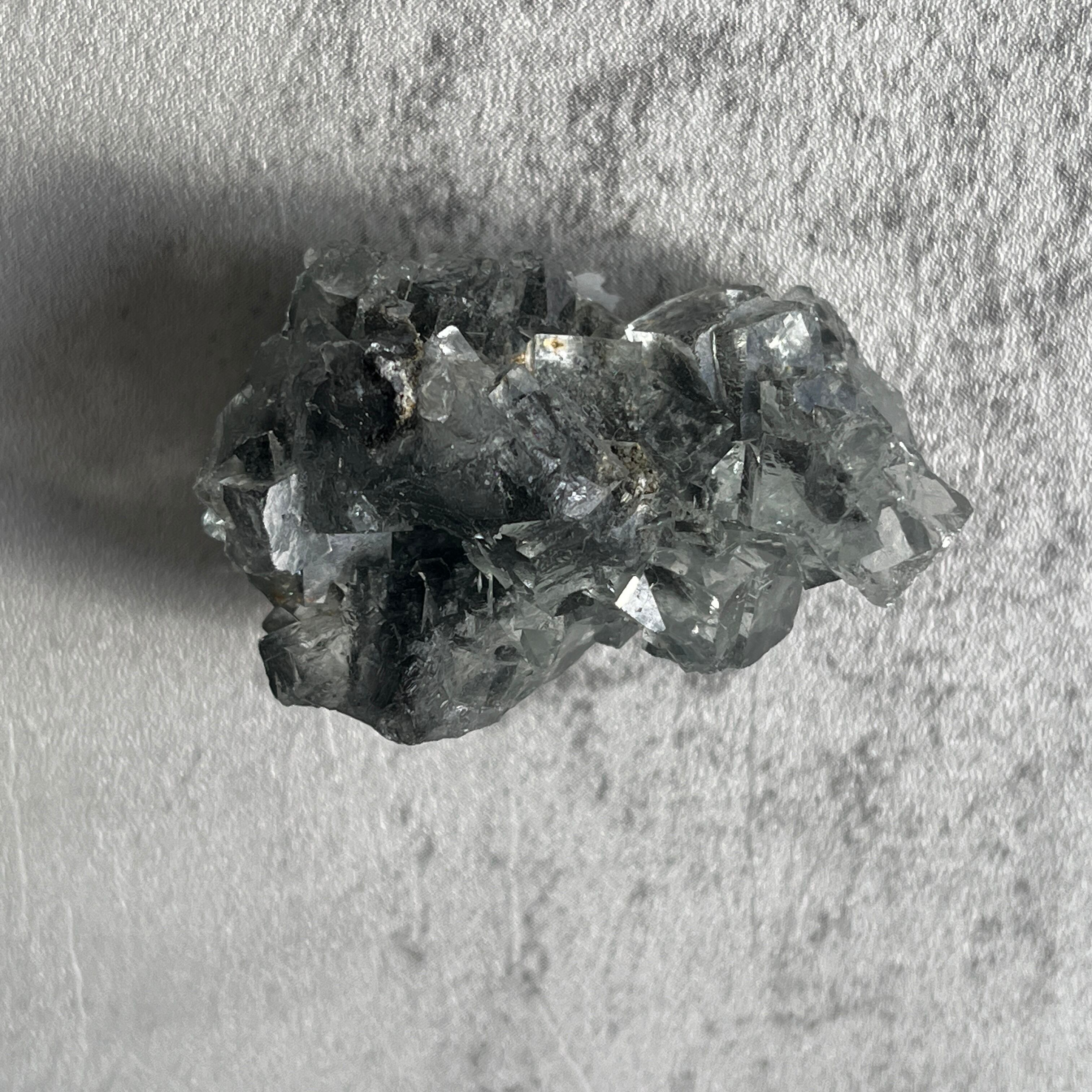 クリアなキューブ型の結晶が折り重なり、一部には虹も見られ、とても美しいです。